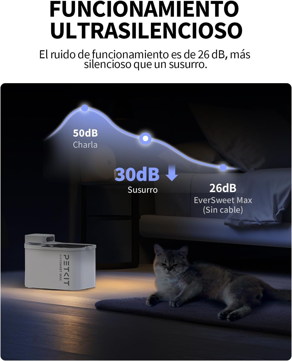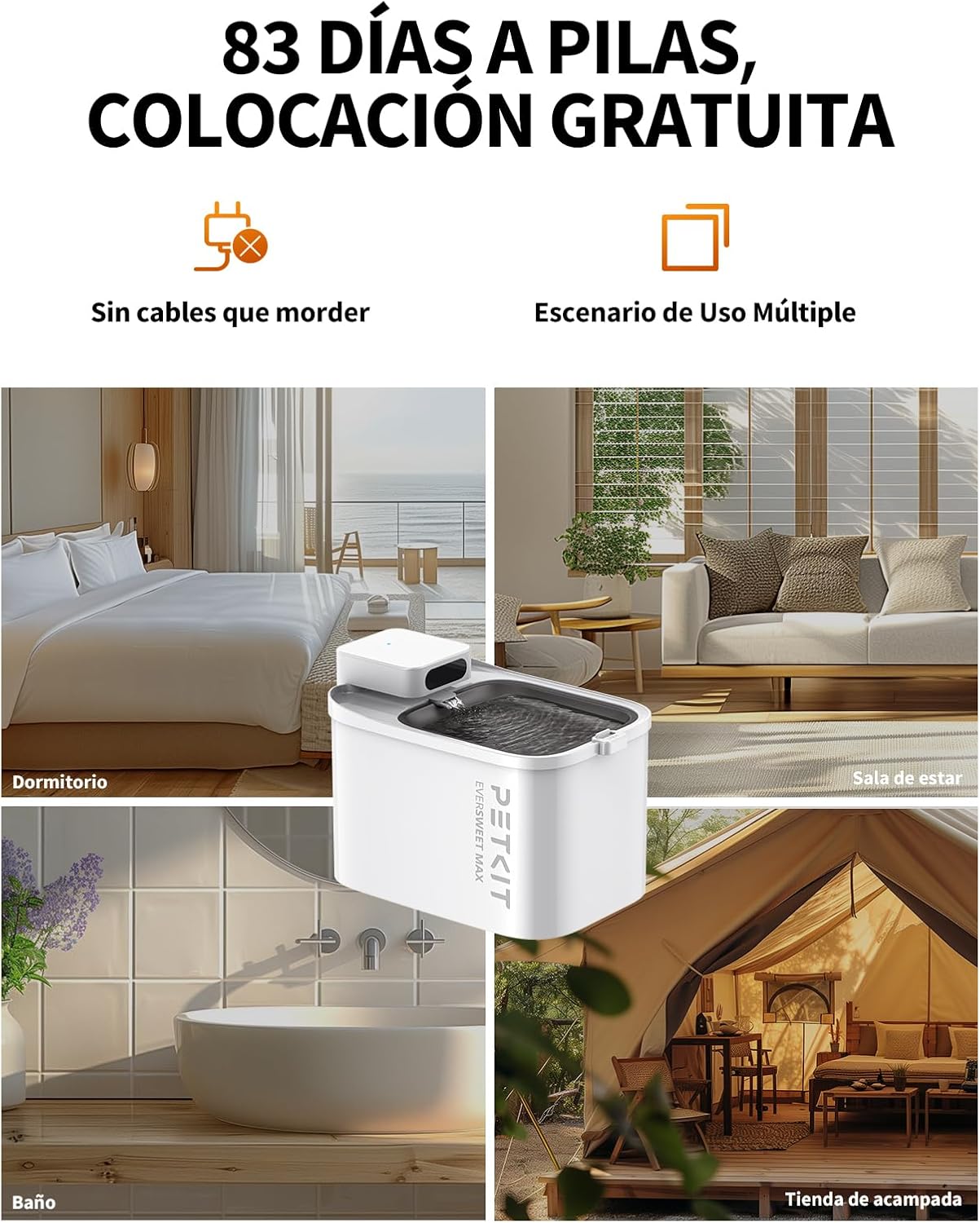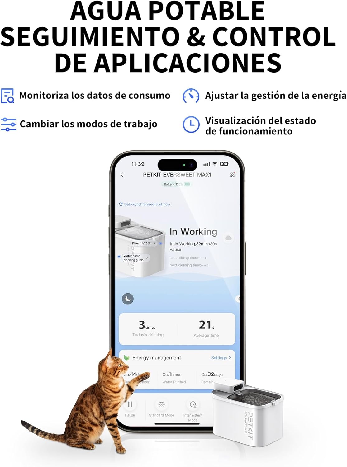 - Fuente para gatos sin cable: la PETKIT EVERSWEET MAX es una fuente inalámbrica diseñada para colocarse en cualquier rincón de tu hogar. Su diseño sin cables elimina riesgos de seguridad, protegiendo a tus gatos de posibles mordeduras. Ofrece múltiples modos de dispensación y la posibilidad de programar el tiempo de suministro de agua a través de la aplicación. Con una capacidad de 3 litros, es ideal para familias con varios felinos.